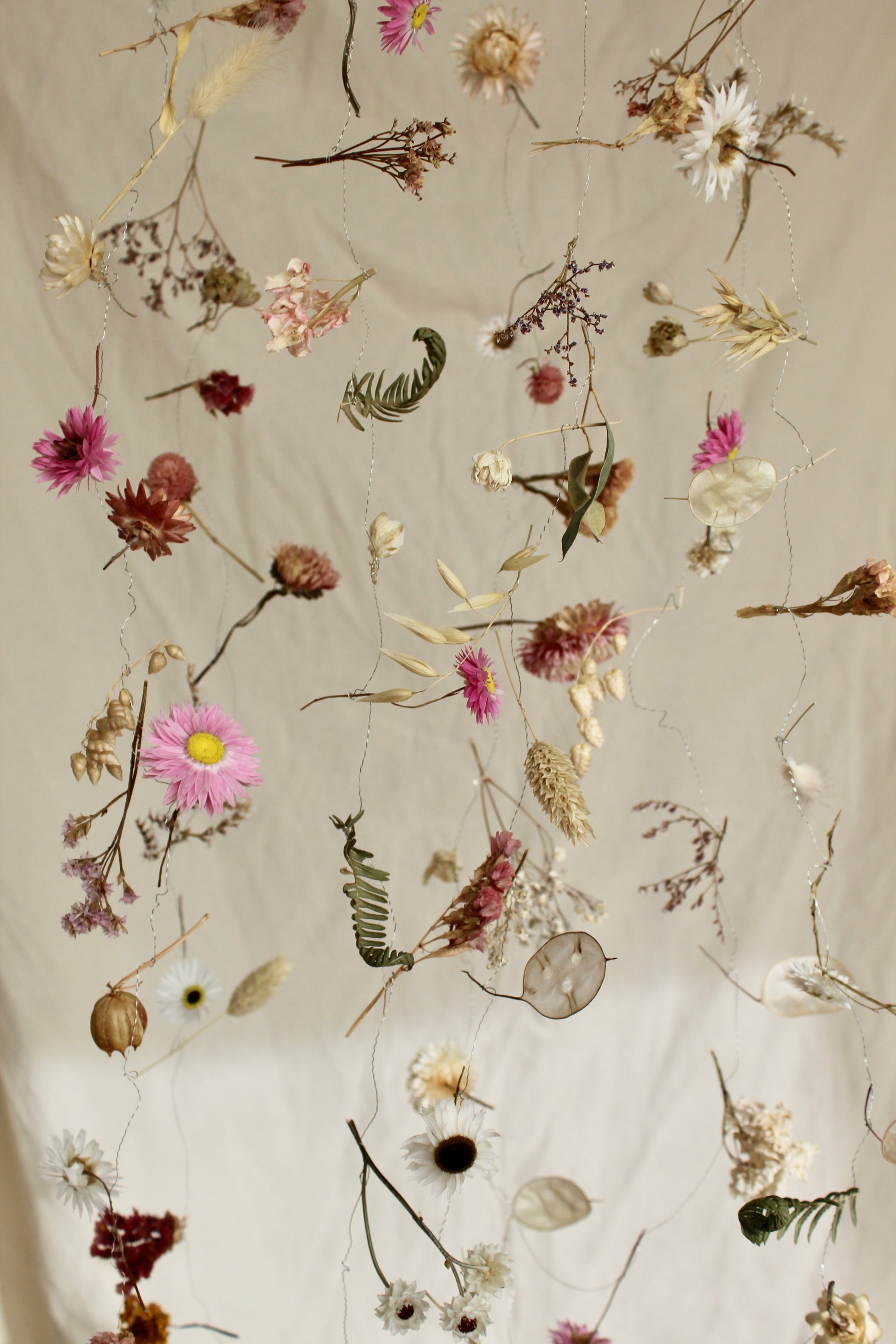 The most beautiful and magical decoration to create that enchanting atmosphere. Delicate and seasonal flowers, seedheads and foliage are carefully attached to a thin crinkled silver wire. These can be hung vertically or horizontally to suit your space.