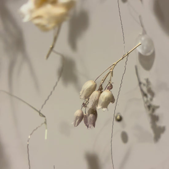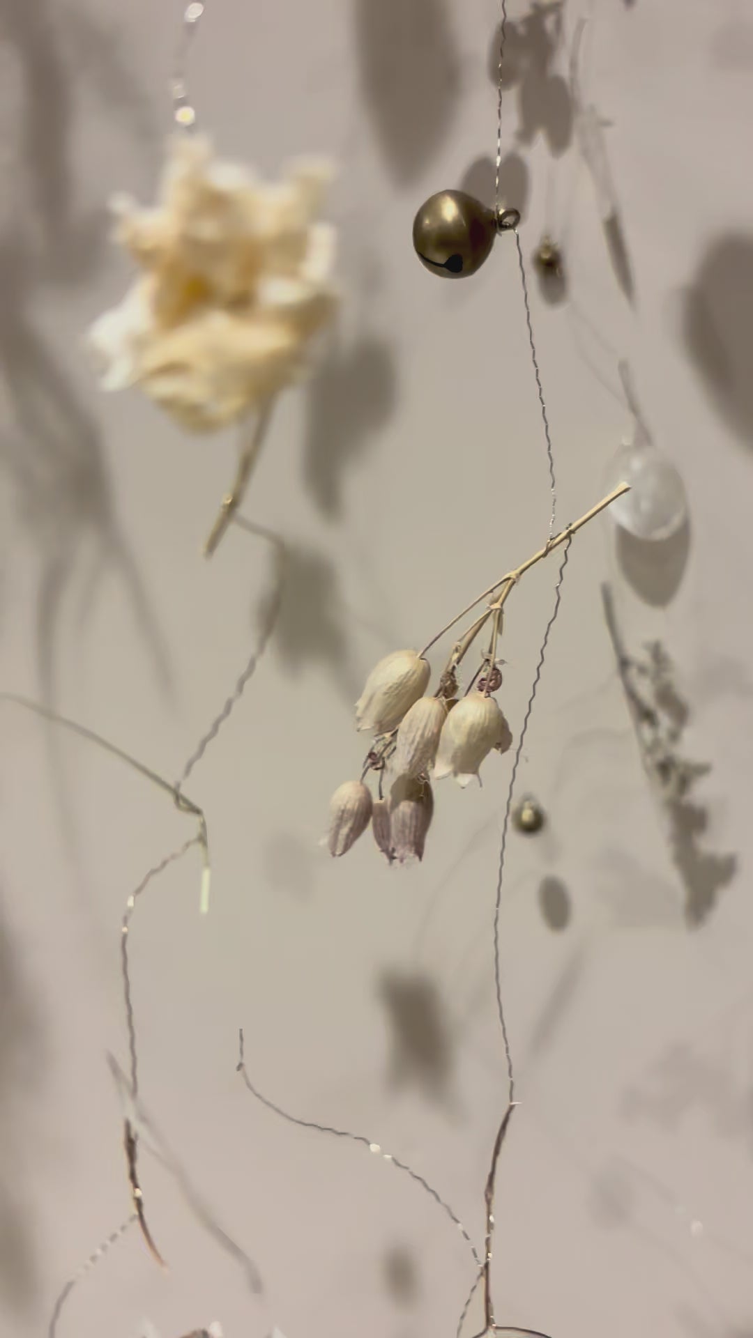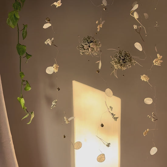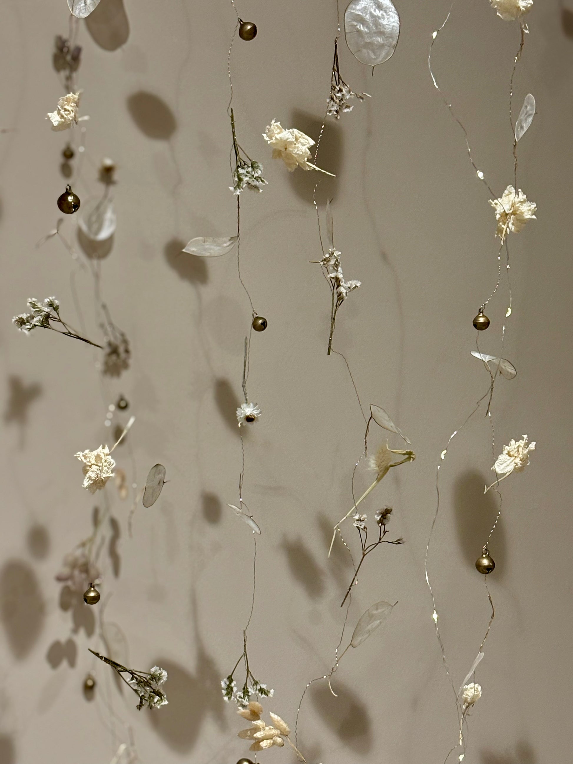 Strings of white and gold. The most dreamy wintery decoration to hang or drape around your space. Natural dried flowers and tiny bells connected to a crinkly gold wire that sparkles in the light. If you want to take them down, store them back in their box and keep them for years to come.