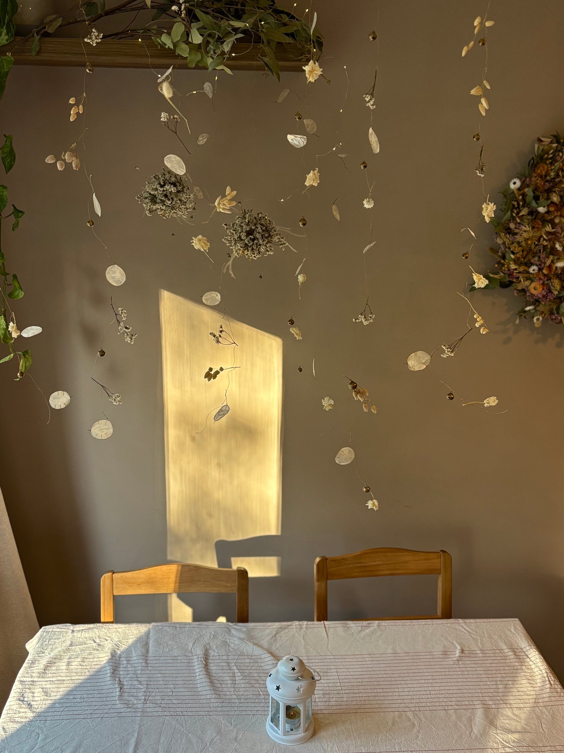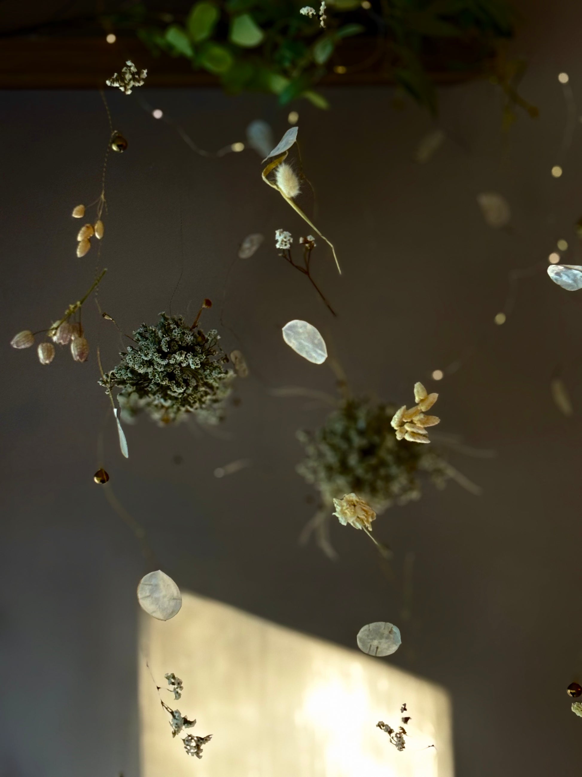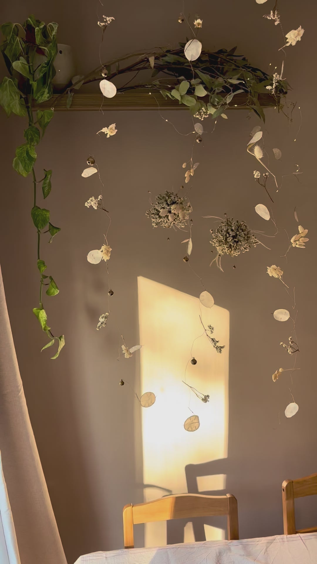 Strings of white and gold. The most dreamy wintery decoration to hang or drape around your space. Natural dried flowers and tiny bells connected to a crinkly gold wire that sparkles in the light. If you want to take them down, store them back in their box and keep them for years to come.